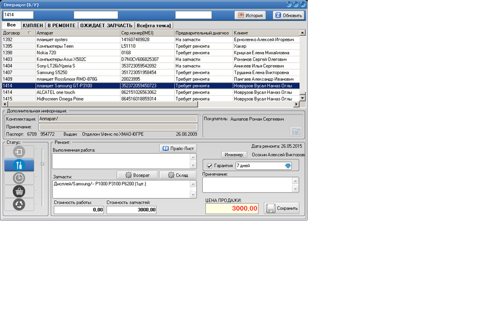 | Description | Не всегда привязываются запчасти со склада по квитанциям в "Сервисном центре" и "Б/У". То есть после перевода в статус "в ремонте" требуется прикрепить имеющуюся запчасть со "склада". Прикрепляем, вроде все нормально, сохраняем результат. Выходим из квитанции и проверяем результат. Не всегда, но после последнего обновления бывает, что запчасть со склада СПИСАЛАСЬ (то есть количество запчастей на одну стало меньше), а к квитанции не прикрепилась. В Б/У также бывает, что невозможно прикрепить нужную запчасть к договору, до тех пор пока не выйдешь из программы и не зайдешь вновь (просто "обновить" не помогает). Еще по модулю "б/у" как так создается (крайне редко, но имеет место быть) один и тот же номер договора по двум разным принятым аппаратам? | ||||