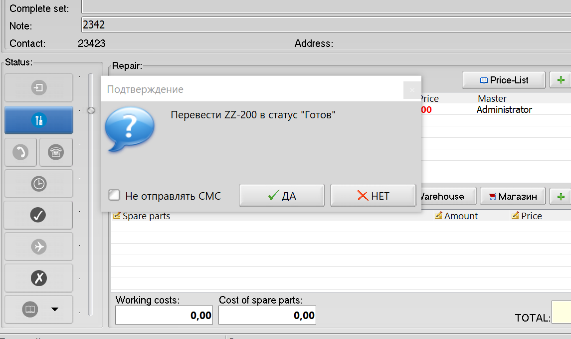 | Description | Добавьте пожалуйста такую опцию в мастерскую чтобы перед тем как перевести заказ в статус ГОТОВ можно было снять галочку с заказа о смс уведомлении, даже если при приемке было включено уведомление, у меня постоянно прилетают жалобы от клиентов что мы ночью отправляем смс и будим их а мы работаем допоздна и бывает в 2 ночи придёт смс клиенту а еще иногда просто не надо отправлять смс тк клиент сидит у нас на месте днем и зачем его уведомлять если он и так у нас | ||||